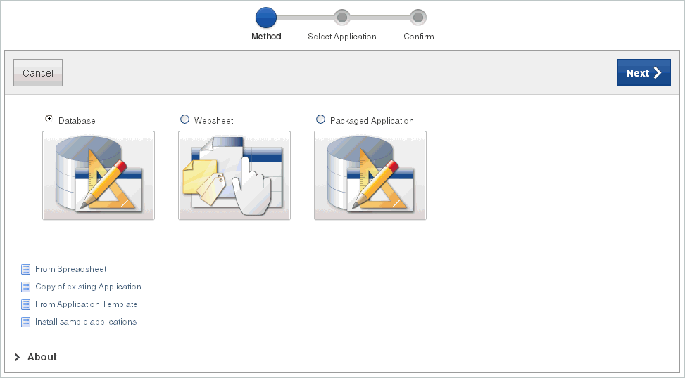 Each page within a wizard displays the title of the wizard (for example, Create Application). Each wizard page also displays a line at the top, representing the sequence of steps. The highlighted circle indicates the step you are performing.