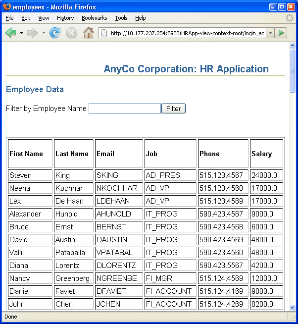 Figure 4-20 Filtered Employee Data in employee.jsp