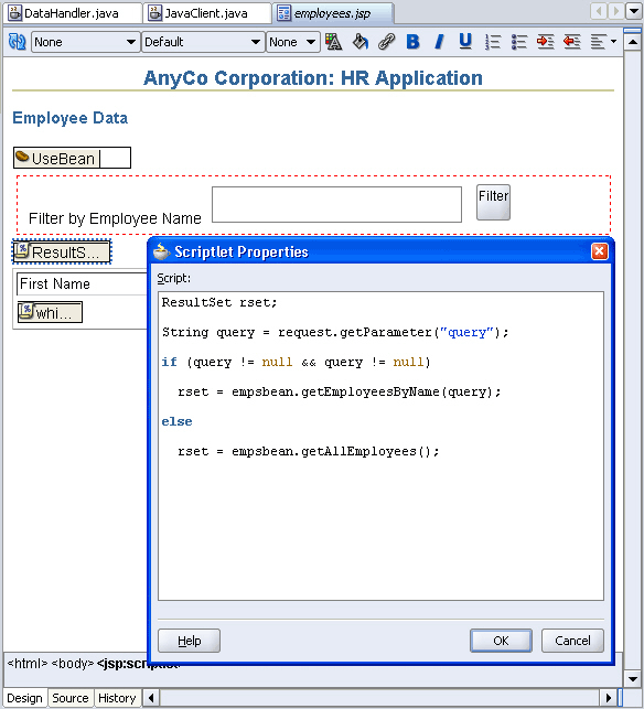 Drag a jsp:usebean tag onto the page. Enter empsbean as the ID and browse to select hr.DataHandler as the Class. Set the Scope to session, and click OK.
