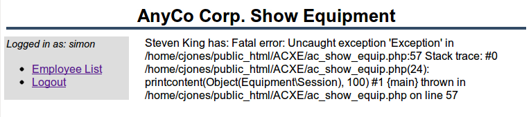 Simulate an error in ac_show_equip.php by editing getempname() and throwing an exception in printcontent(). PHP will give a run time error when it reaches that call: