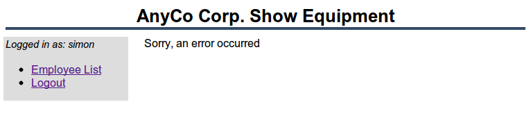Run the application and login. Click Show to see an employee's equipment. The error page is shown: