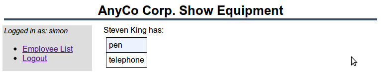 Save all files and run the application in a browser. Login as either Simon or Administrator. Click the Show link next to Steven King. The equipment he has is displayed: