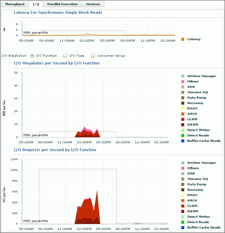 See "Monitoring Instance Activity" for a description of the Throughput, I/O, Parallel Execution, and Services charts.