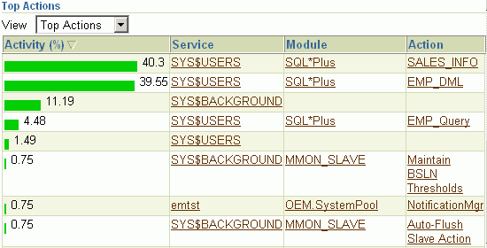 The Top Actions table displays the top actions waiting for the corresponding wait event during the selected time period. For example, in Figure 4-5, the SALES_INFO action associated with the SQL*Plus module is consuming 40.3% of the database activity, while EMP_DML is consuming 39.55% and EMP_Query is consuming 4.48%. This information is consistent with Figure 4-2, which shows that the database sessions for user HR are consuming over 82% of database activity.