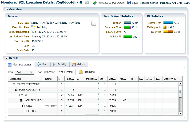 The Monitored SQL Execution Details page for the operation appears. In the Details section, the Plan Statistics subpage is selected by default.