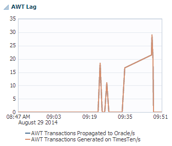 The AWT lag region uses a line graph to show the number of AWT transactions propagated to the Oracle database and generated on the TimesTen database per second.