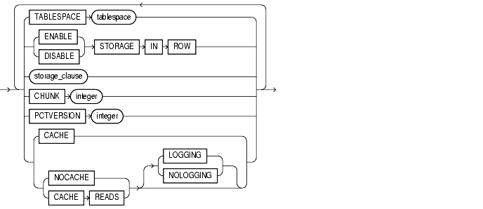 LOB_storage_clause for an added or modified LOB column: TABLESPACE, storage_clause, LOGGING or NOLOGGING, or the LOB_index_clause.