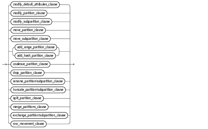 Restriction: You can specify only one list of partition_storage_clauses per ALTER TABLE statement, and all LOB_storage_clauses and varray_storage_clauses must precede the list of partition_storage_clauses.