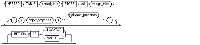 the nested_table_storage_clause lets you specify separate storage characteristics for a nested table, which in turn enables you to define the nested table as an index-organized table. You must include this clause when creating a table with columns or column attributes whose type is a nested table. (Clauses within this clause that function the same way they function for parent object tables are not repeated here.)