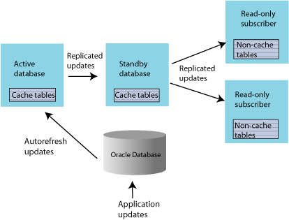 Application updates are made to the active database, the updates are replicated to the standby database, and then the updates are asynchronously written to the Oracle database by the standby. At the same time, the updates are also replicated from the standby to the read-only subscribers, which may be used to distribute the load from reading applications. The tables on the read-only subscribers are not in cache groups.