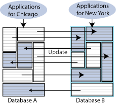 Consider the example shown in Figure 1-7, where the accounts for Chicago are processed on database A while the accounts for New York are processed on database B.