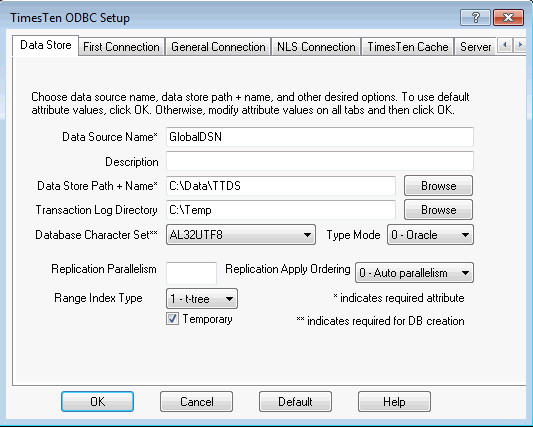 For a complete description of all attributes, see "Connection Attributes" in the Oracle TimesTen In-Memory Database Reference.Data Store attributes are associated with a database when it is created and cannot be modified by subsequent connections. They can only be changed by destroying and re-creating the database.