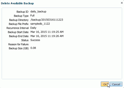 The Delete Available Backup dialog closes and the Backup History tab of the Backup and Restore page refreshes. You can verify that the TimesTen backup entry has been deleted by reviewing the Backup History tab of the Backup and Restore page. You should no longer see your TimesTen backup entry.